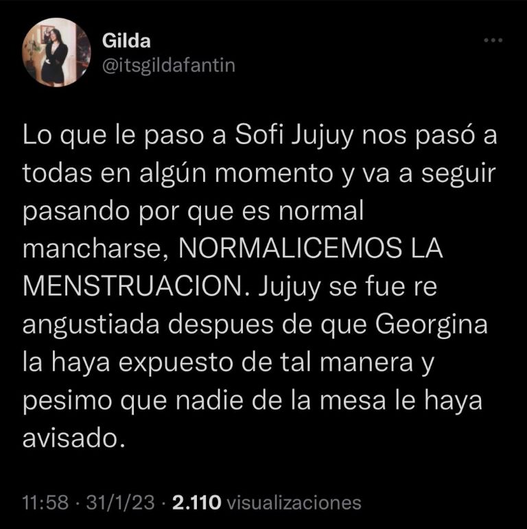 Resulta que, estaba invitada la modelo y conductora Sofía “Jujuy” Jiménez y en el momento de pasar ante la cámara se vio una pequeña mancha de sangre en su pantalón, lo que inmediatamente incomodó a todos y "sutilmente" la mandaron a cambiarse.