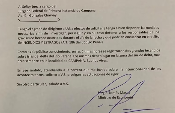 A través de una carta dirigida al Juez Federal de Primera Instancia de Campana, Adrián González Charvay, el ministro de Economía, Sergio Massa, solicitó que se tomen las medidas necesarias a fin de “investigar, perseguir y en su caso detener a los responsables de los gravísimos hechos ocurridos durante el día de la fecha (1 de marzo de 2023) y que podrían encuadrar en el delito de incendios y estragos (Art. 186 del Código Penal)”.
