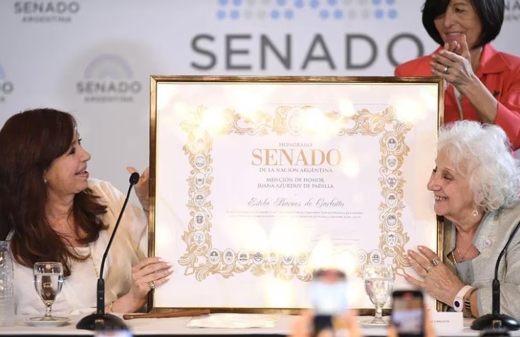 Junto a la vicepresidenta se ubicó la titular de Abuelas de Plaza de Mayo, Estela de Carlotto, quien fue reconocida con la mención de honor “Juana Azurduy”, la primera otorgada por Cristina Kirchner desde que ocupa la presidencia de la Cámara Alta. Con ella, Sonia Torres de Parodi, Carmen Ledda Barreiro y Buscarita Imperí Roa, fundadoras de la histórica institución, también recibieron el reconocimiento.