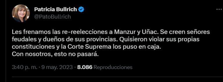 A partir de la medida adoptada por la Corte Suprema de Justicia, la dirigente opositora Patricia Bullrich celebró lo ocurrido: "Les frenamos las re-reelecciones a Manzur y Uñac", escribió en su cuenta de Twitter, con respecto a la suspensión de los comicios a gobernador y vice en las provincias de Tucumán y San Juan.