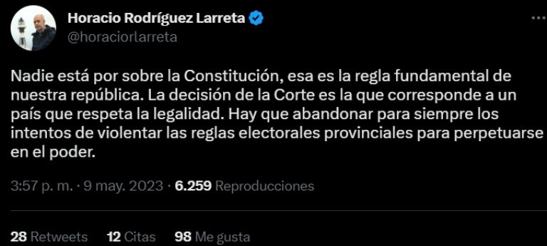 En el mismo sentido, el jefe porteño Horacio Rodríguez Larreta se pronunció conforme con la decisión: "Nadie está por sobre la Constitución, esa es la regla fundamental de nuestra república. La decisión de la Corte es la que corresponde a un país que respeta la legalidad. Hay que abandonar para siempre los intentos de violentar las reglas electorales provinciales para perpetuarse en el poder", expresó en sus redes sociales.