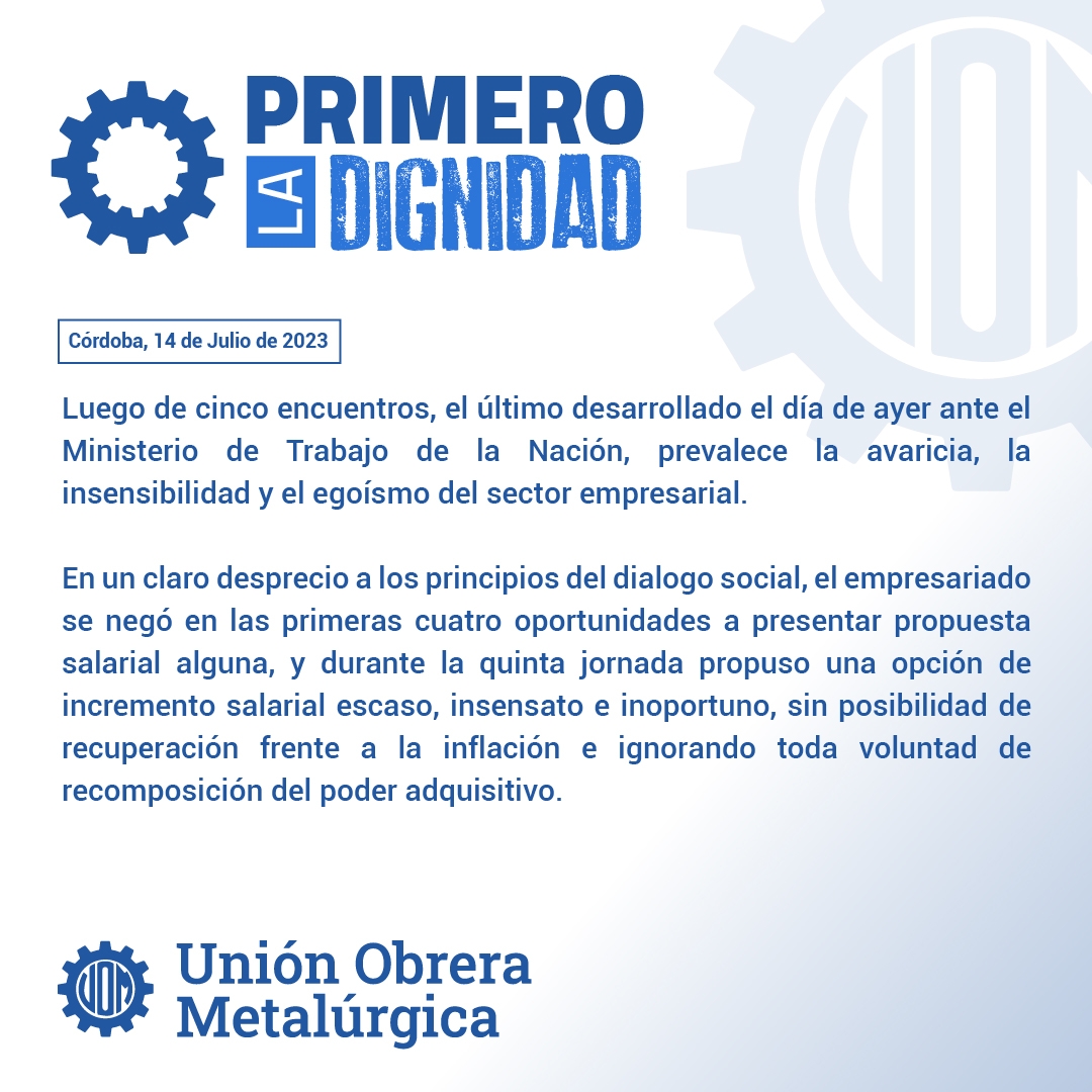 “Habiéndose agotado la paciencia de quienes nos sobran días para llegar a fin de mes, de quienes trabajamos más y ganamos menos, vamos a luchar por la recuperación del salario y el valor de nuestro trabajo como la base de la dignidad del ser humano”, concluyó el sindicato metalúrgico tras cinco encuentros de negociación paritaria infructuosos.