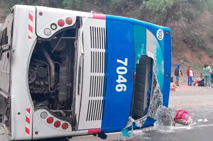 Debido al impacto, el micro volcó de costado y quedó sobre el borde de la ruta junto a una decena de bolsos desparramados y gente golpeada y atrapada adentro, que exclamaban auxilio para poder salir.
