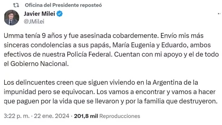 “Acaba de fallecer Umma de 9 años asesinada por delincuentes luego de intentar robar a sus padres, ambos integrantes de la Policía Federal Argentina. Mi abrazo a la familia y el apoyo de nuestro gobierno a todos los argentinos de bien y a los policías que nos cuidan diariamente. QEPD Umma”, escribió, por su parte, la vicepresidenta Victoria Villarruel.