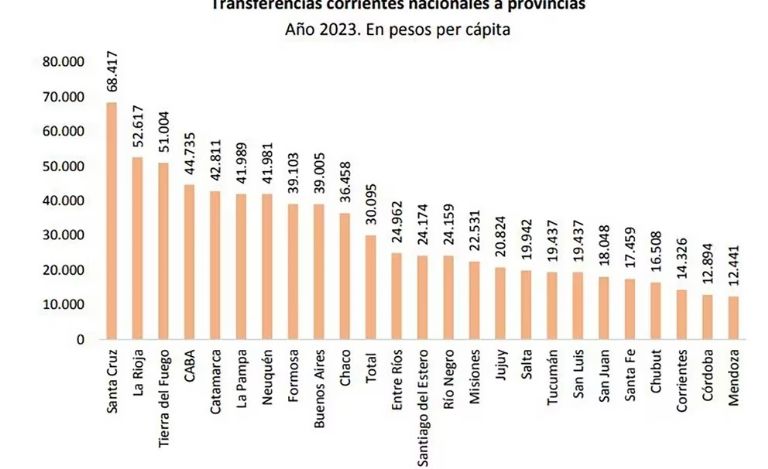 Cuando se suman las transferencias “discrecionales” corrientes y de capital y se las mide en relación a la población, la provincia que encabeza el ranking es Santa Cruz, con $68.417 per cápita en obras y programas, seguida por La Rioja, Tierra del Fuego y CABA.