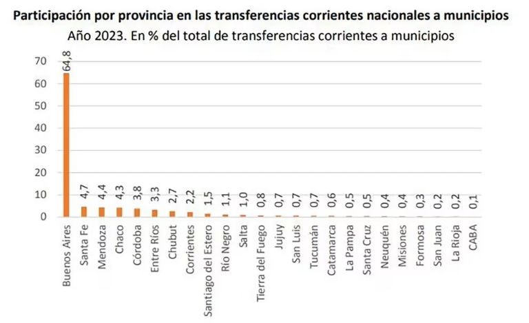 A su vez, en transferencias discrecionales de capital a municipios, la número uno vuelve a ser la provincia de Buenos Aires, cuyas intendencias recibieron el 63% del total.