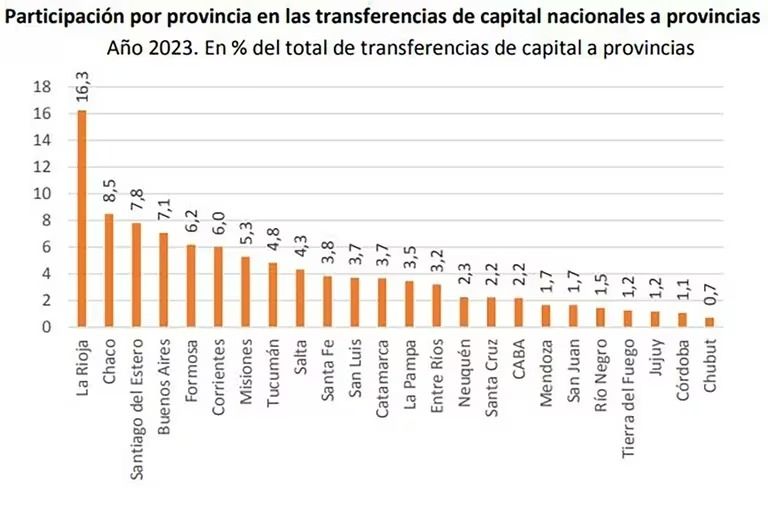 En las transferencias discrecionales “de capital” la provincia mimada fue La Rioja, que pese a explicar el 0,8% de la población del país, recibió el 16% del total, esto es 20 veces más que lo que sugeriría su peso poblacional.