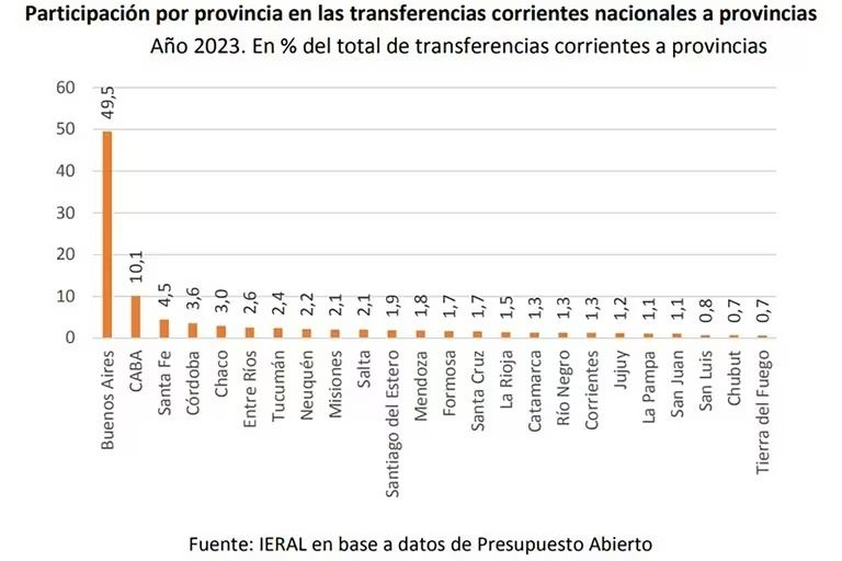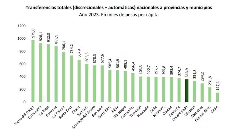 Sumando transferencias “automáticas” y “discrecionales”, en 2023 la provincia de Buenos Aires recibió 25% del total, uno de los porcentajes más altos desde que rige la actual ley de coparticipación, aunque si se mide por habitante, los distritos que recibieron más dinero per cápita fueron Tierra del Fuego, Catamarca, La Rioja y Formosa, y los más bajos CABA, Buenos Aires, Mendoza y Córdoba.