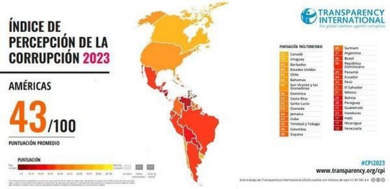 “Argentina se mantiene en el fondo de la tabla de posiciones, en el pelotón de países latinoamericanos relegados, aunque ligeramente mejor que Brasil (36/100), Ecuador (34/100) Perú (33/100), México (31/100), Bolivia (29/100), Paraguay (28/100) y Venezuela (bien al final con 13/100). Pero se ubica muy por debajo de los líderes indiscutibles de la transparencia latinoamericana que siguen siendo Chile (66/100) y Uruguay (73/100) y por debajo del promedio de América que se mantiene sin cambios en 43/100.