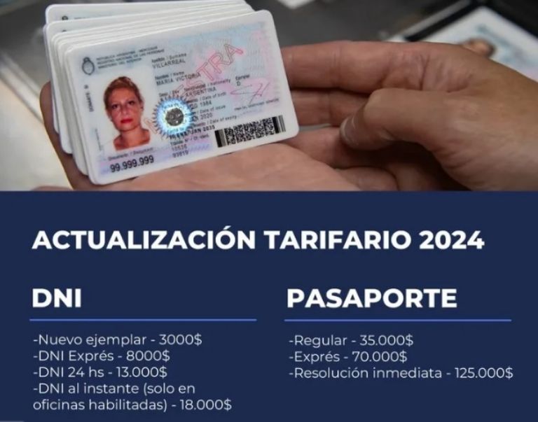 El Registro Nacional de las Personas (Renaper) actualizó el cuadro tarifario para la obtención del Documento Nacional de Identidad (DNI) y del Pasaporte, con lo cual los nuevos precios van de un mínimo de $3.000 para sacar el DNI a un máximo de $125.000 para obtener el pasaporte al instante, de acuerdo a lo informado hoy por el Ministerio del Interior.