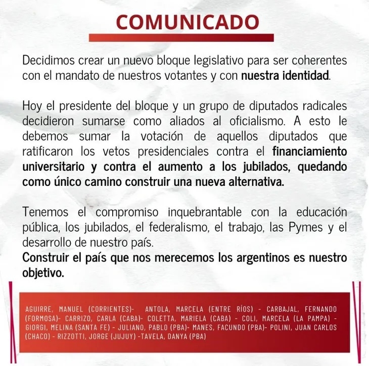 Además, apuntaron contra De Loredo tras la reunión en Casa Rosada: ''Hoy el presidente del bloque y un grupo de diputados radicales decidieron sumarse como aliados al oficialismo. A esto le debemos sumar la votación de aquellos diputados que ratificaron los vetos presidenciales contra el financiamiento universitario y contra el aumento a los jubilados, quedando como único camino construir una nueva alternativa''.