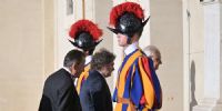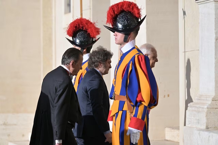 El mandatario llegó al Patio San Dámaso del Vaticano a las 8.57 locales, en donde fue recibido por el responsable de la Prefectura de la Casa Pontificia, Leonardo Sapienza, mientras una bandera argentina flameaba en el frente del edificio y los guardias suizos formaban el tradicional piquete de honor.