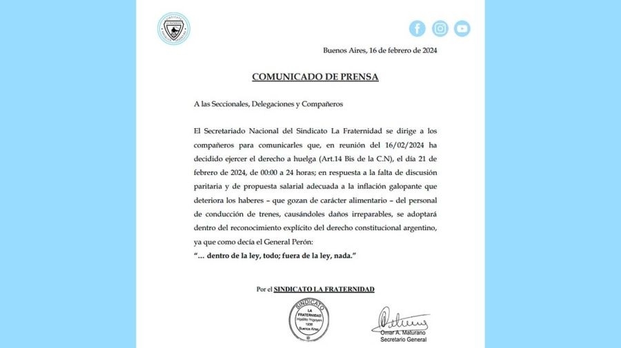 Las autoridades del gremio ferroviario enmarcaron la medida de fuerza según el artículo 14 Bis de la Constitución Nacional. Sobre el final del comunicado, el texto incluyó una cita del expresidente Juan Domingo Perón: "Dentro de la ley, todo; fuera de la ley, nada".