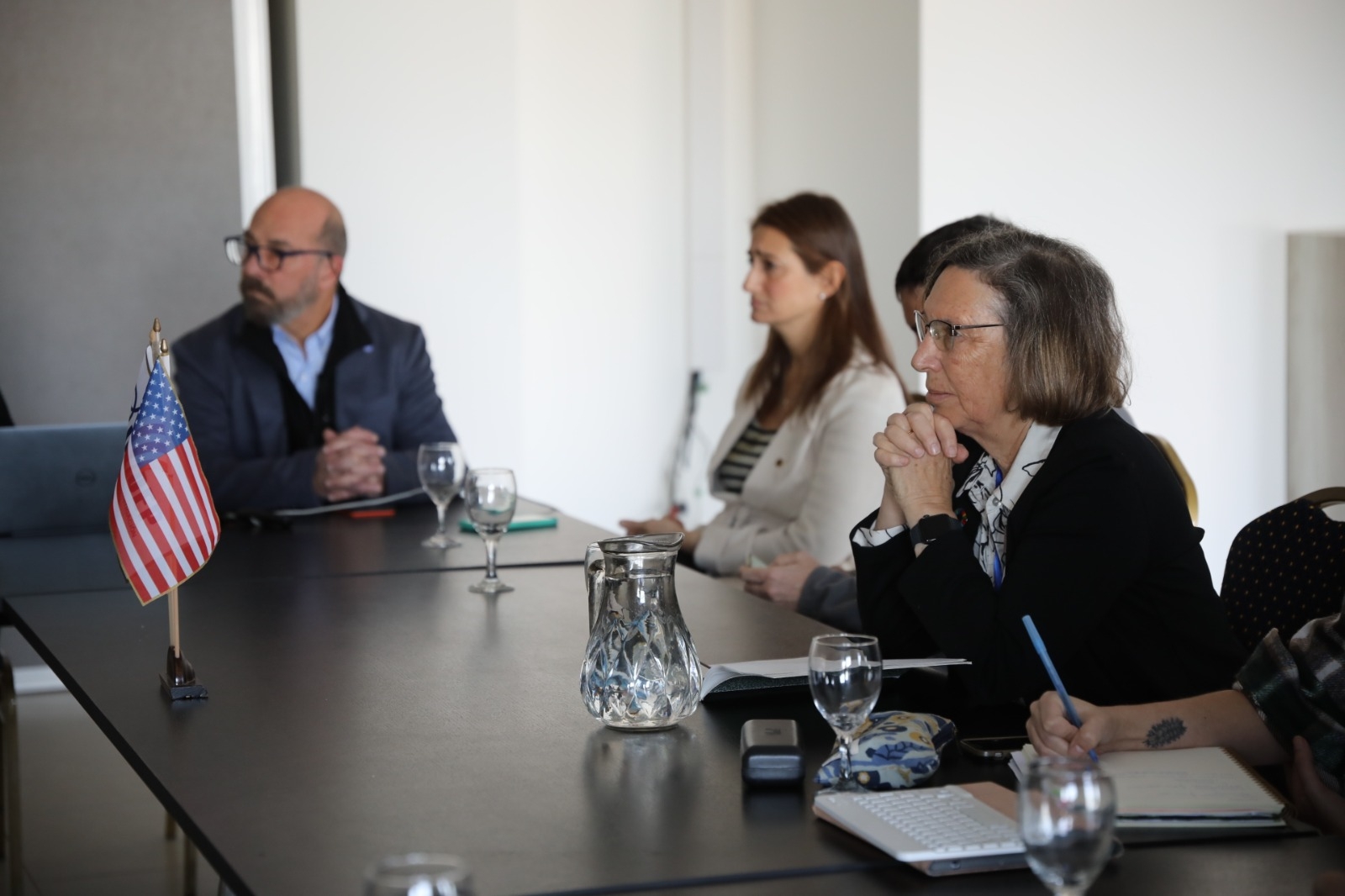 En el inicio de la jornada, el director del Instituto, Mag. Gonzalo Eduardo Bacigalupo junto al director Nacional de Investigación, Dr. Otto Wöhler, la directora de Pesquerías de Invertebrados y Ambiente Marino, Dra. María Inés Militelli e investigadores del INIDEP, mantuvieron un encuentro con la Dra. Levin, en el que se presentaron las líneas de investigación del organismo.