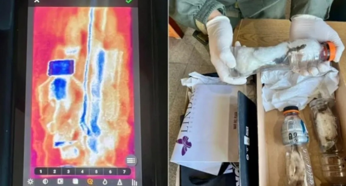 En este aparato, se observó la imagen orgánica de botellas con reptiles pequeños y los funcionarios procedieron a abrir las mismas en presencia de testigos, constatando la presencia de tres lagartos Gecko Cacero Tropical, originarios de África. Los mismos serán entregados a Fauna Regional de San Antonio Oeste, provincia de Río Negro.