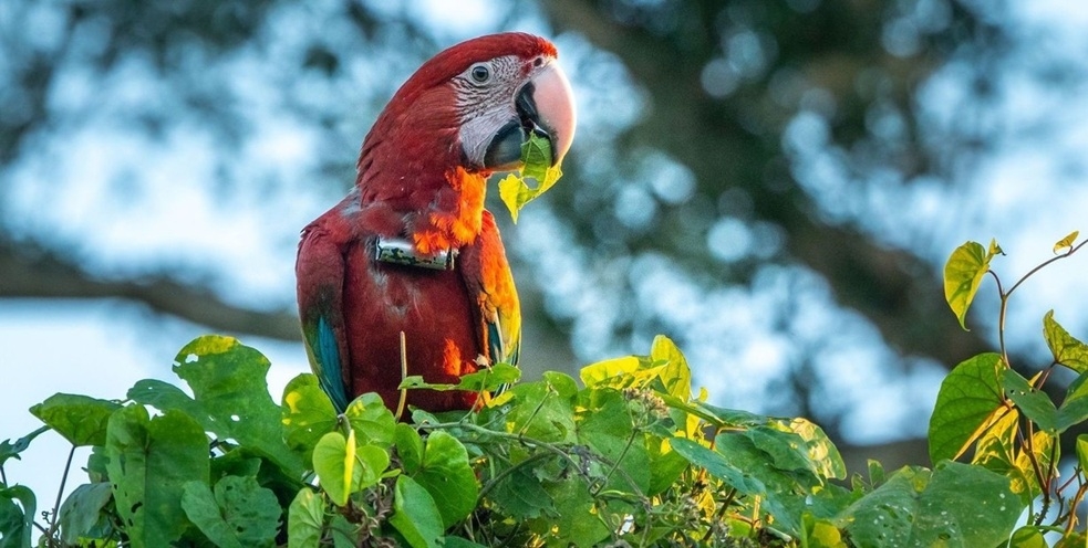El guacamayo, bautizado con el nombre de “Charrúa”, es uno de los ejemplares protegidos que nació en Corrientes tras la reintroducción de la especie por parte de la Fundación Rewilding Argentina, Parques Nacionales y la Provincia.