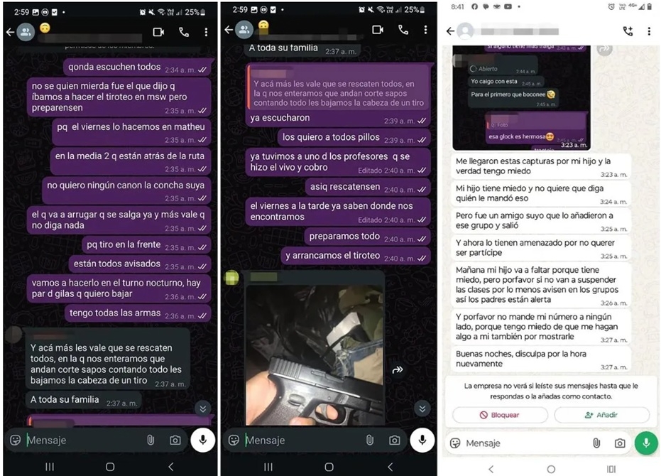 La denuncia fue realizada por el padre de uno de los alumnos de la escuela, quien entregó capturas de pantalla a la Policía Bonaerense donde se revelan las temibles conversaciones entre los menores. Según confirmaron fuentes judiciales, los alumnos de la escuela Fray Luis Beltrán habrían utilizado el grupo de WhatsApp para planificar un tiroteo dentro del colegio secundario.
