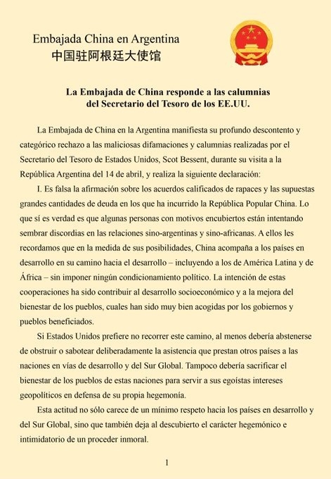 En el comunicado, la representación diplomática manifestó su “profundo descontento y categórico rechazo a las maliciosas difamaciones y calumnias” realizadas por Bessent, y puntualizó que “China acompaña a los países en desarrollo en su camino hacia el desarrollo sin imponer ningún condicionamiento político”.