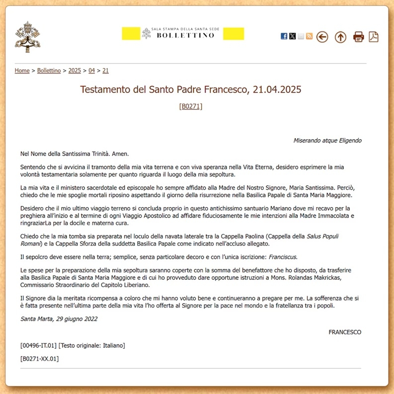 El Papa confirmó en su testamento final que deseaba ser enterrado en la Basílica de Santa María la Mayor de Roma y “sin decoración particular”.