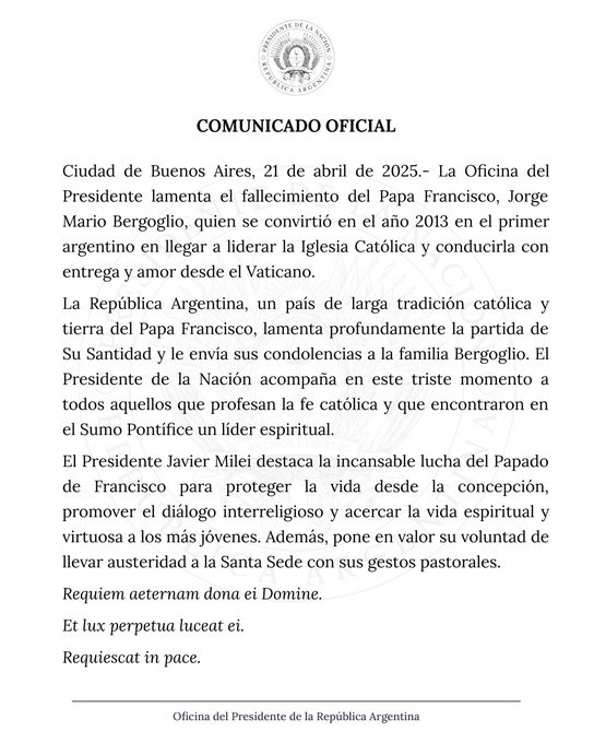 A continuacuón el texto completo: "La Oficina del Presidente lamenta el fallecimiento del Papa Francisco, Jorge Mario Bergoglio, quien se convirtió en el año 2013 en el primer argentino en llegar a liderar la Iglesia Católica y conducirla con entrega y amor desde el Vaticano. La República Argentina, un país de larga tradición católica y tierra del Papa Francisco, lamenta profundamente la partida de Su Santidad y le envía sus condolencias a la familia Bergoglio.