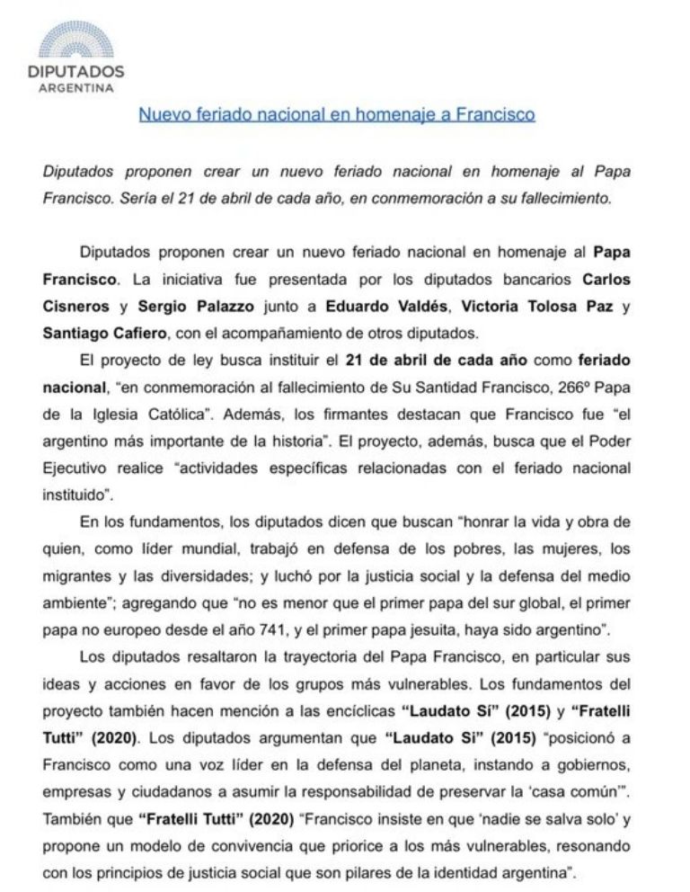 Los legisladores que impulsan este proyecto consideran que establecer un feriado nacional en honor al papa Francisco sería una forma de reafirmar valores profundamente arraigados en la identidad argentina, como la igualdad, la fraternidad y el compromiso social, que el pontífice promovió en su labor diaria. Para los autores del proyecto, este gesto no solo reconocería su importancia como argentino, sino también como uno de los referentes globales más influyentes del siglo XXI.