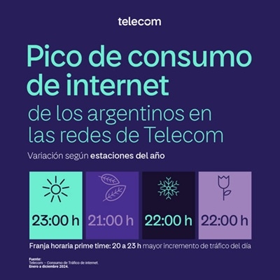 Telecom analizó el comportamiento del tráfico global y las tendencias de uso en la red durante 2024. Se detectaron que las franjas horarias de mayor consumo se concentraron entre las 21:00 y las 23:00 horas, reflejando una fuerte demanda de conectividad en horarios nocturnos.