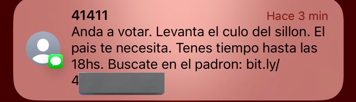 “Andá a votar. Levantá el culo del sillón. El país te necesita. Tenés tiempo hasta las 18hs. Buscate en el padrón.”