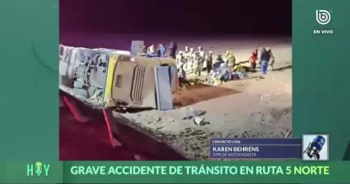 Al menos cuatro fallecidos y múltiples heridos de diversa consideración dejó hasta el momento el siniestro vial protagonizado por un ómnibus de larga distancia, de patente argentina, que este lunes terminó volcado en la Ruta 5 Norte a la altura de Taltal, región de Antofagasta.