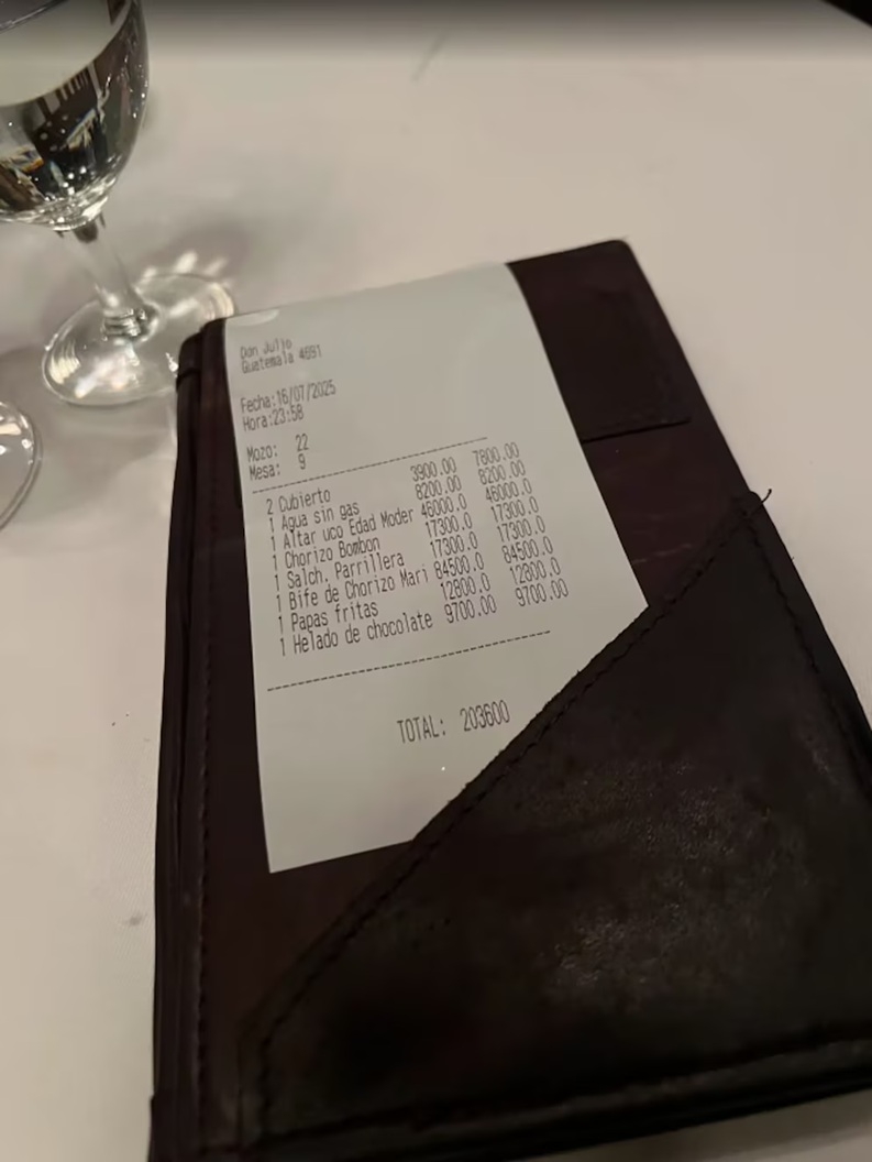 El detalle del ticket permitió observar cómo se componen los precios en restaurantes de alta gama. En este caso, el costo de los platos principales y el vino explicaron la mayor parte del monto final. La información proporcionada en la foto funcionó como referencia para quienes querían conocer en detalle el valor exacto de una comida completa en uno de los lugares más reconocidos de la ciudad.