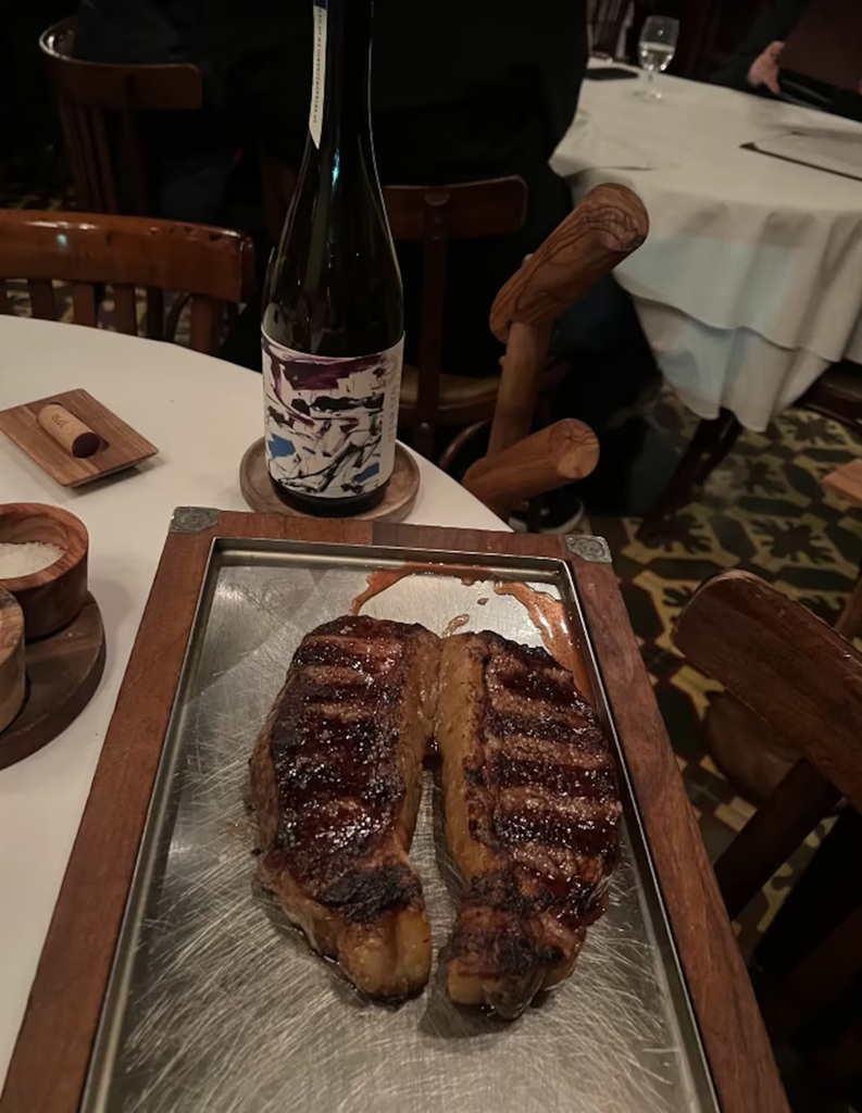La cuenta de la pareja mostró la popularidad de los cortes de bife de chorizo, uno de los clásicos más solicitados del menú. Elegir este corte duplicó el precio debido al pedido de dos porciones, lo que resultó en un impacto considerable en el total. A esto se sumó la selección de una botella de vino Malbec de categoría y los acompañamientos tradicionales. El postre de helado de chocolate completó la experiencia.
