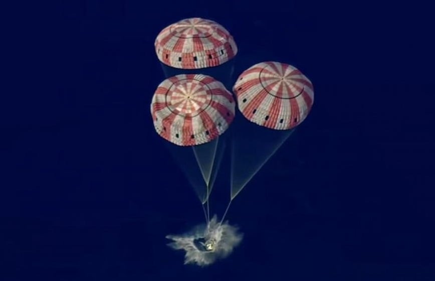Tras superar la fase de calor extremo, la cápsula desplegó su sistema de paracaídas, lo que permitió reducir progresivamente la velocidad hasta lograr un amerizaje controlado en el Pacífico.