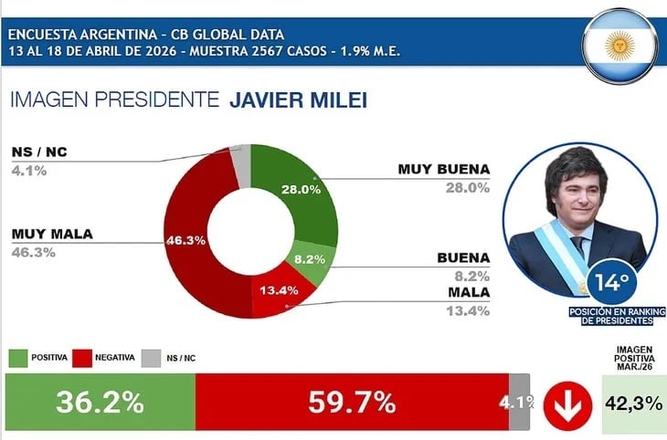 El estudio de la CB Global Data revela que, durante el mes de abril, el mandatario argentino ocupa el puesto 14 del ranking con una imagen positiva del 36,2% y una negativa del 59,7%. Se trata de un nuevo descenso con una merma de 4,1% contra el mes anterior cuando ocupó el 11 lugar.
