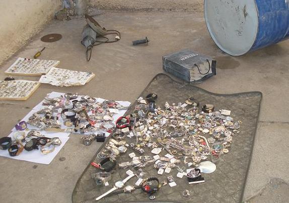 Un empleado de limpieza encontró en la plaza de estacionamiento del Hotel Ancasti, los elementos que fueron robados en la Joyería Dakar el pasado sábado. Encontró la amoladora, relojes, anillos, pulseras, entre otros objetos de gran valor.