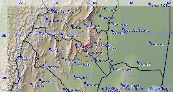 El epicentro se ubicó a 50 Km en dirección suroeste de la ciudad de San Fernando del Valle de Catamarca , en el flanco oeste de la Sierra de Ambato..