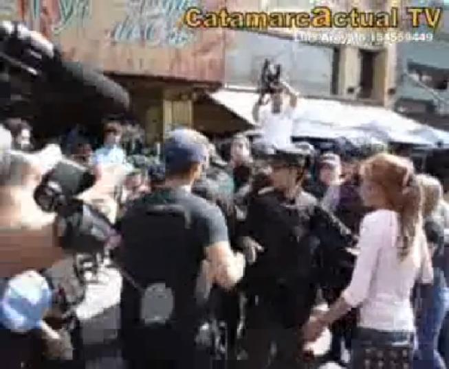 Uno de los manifestantes quiso prender fuego un neumático como modo de protesta, cuando los efectivos policiales se lo impidieron, lo que originó el enojo y posterior forcejeo.