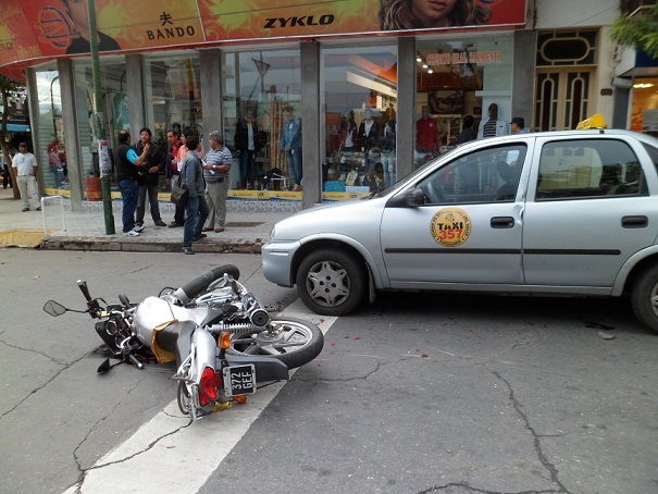 Hoy a las 8.30, en la esquina de Rivadavia y San Martín, un Chevrolet Corsa (GHP-798), taxi, al mando de Mauricio Leiva (22), fue colisionado desde atrás por una motocicleta Honda 125cc. (372-GEF), que conducía Damián Romero (27).