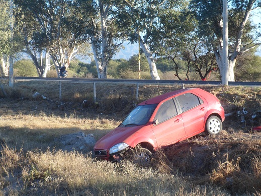 Aparentemente, por causas que se desconocen, un auto Fiat Palio color rojo patente HKS 329 se salio de la cinta asfáltica cayéndose en una zanja y produciendo daños materiales de consideración una de las ocupantes fue trasladada al hospital de urgencia, ya que revestía heridas.