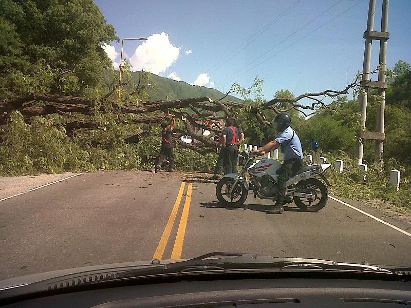 En la mañana de ayer un árbol de grandes dimensiones cayó sobre la ruta N°4 a la altura del calvario provocando inconvenientes en los numerosos vehículos que se dirigian a las villas ambateñas de El Rodeo y Las Juntas. Los primeros en llegar al lugar para ordenar el tránsito fueron los agentes municipales que organizaron un precario desvio para permitir la circulación. Enseguida se presentaron los bomberos de la policía de la provincia que con hachas removieron algunas ramas. Luego llegó la colaboración de la Ec Sapem Energía que aportó motosierras para agilizar el trozado del inmenso árbol, algo que lograron tras una hora de arduo trabajo.
