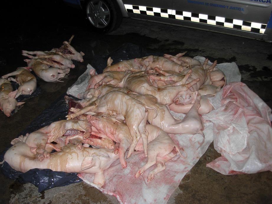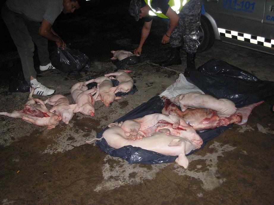 En la oportunidad, procedieron a la detención de un VW Gol, al mando de un hombre de apellido González, que transportaba 14 animales porcinos y un cordero faenados en bolsas arpilleras.