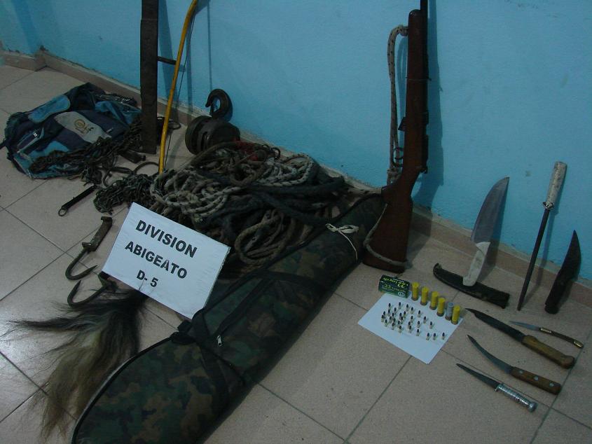 Allí se secuestraron 2 animales vacunos de corta edad, 1 carabina Calibre 22 mm. con 31 proyectiles, 6 cuchillos de diferentes tamaños, sogas y diversos elementos de faena y carnicería.
