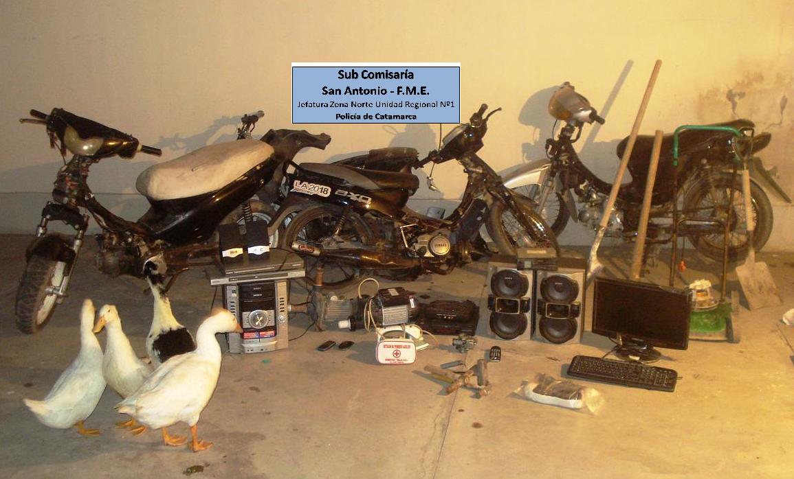 También se secuestro: un monitor de PC, un teclado para PC, un juego de parlantes de PC, dos bombas de agua, una plancha, dos celulares, un stereo, una consola de videos juegos, tres reproductores de DVD, un par de zapatillas, diversas herramientas de albañilería, una netbook, un equipo de música completo, una maquina de cortar cesped, dos patos y dos gansos.