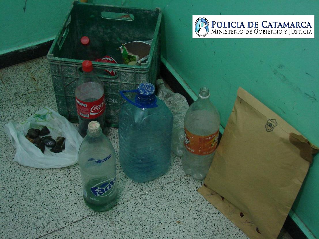 El procedimiento se efectuó en una obra en construcción del barrio Eva Perón, ubicada en la Manzana 4. Del lugar se procedió al secuestro de un cajón de plástico con cuatro botellas de plástico, dos de las cuáles contenían combustible, también gran cantidad de piedras, una máquina para armado de cigarrillos caseros, y envoltorios de plástico con una sustancia herbácea.
