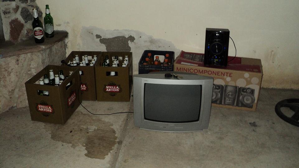La policía secuestro 3 bolsas de achuras de 8 kilos aproximadamente cada una, dos cajones de cerveza y uno de gaseosa, una parrilla, un televisor, un equipo de música, dos ventiladores de pies, y dos colchones.
