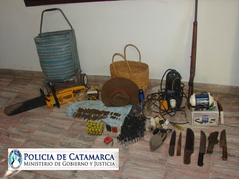 Tras una persecución, lograron aprehender a David Fernando Canciani (18) y, tras realizar un rastrillaje por el lugar, encontraron oculto entre la maleza un rifle automático marca Tala, con mira, calibre 22, una moto sierra, una bomba de agua sumergible para pileta, 115 cartuchos PG (Propósito General) 1270, 51 municiones 7,62 para FAL, cinco municiones calibre 45, cinco municiones calibre 9 mm., dos municiones cal 38 y una munición calibre 22, tres adaptadores, una jarra de vidrio, una canasta de mimbre, un bolso plástico con ruedas, 14 triples, dos portalámparas, un pasador de acero, un cuchillo de cocina, un sombrero de gamuza con la inscripción interna Ejército Argentino, un inflador eléctrico para autos, una cinta métrica, un destornillador, un gancho de hierro y tres cuchillos de acero con fundas.
