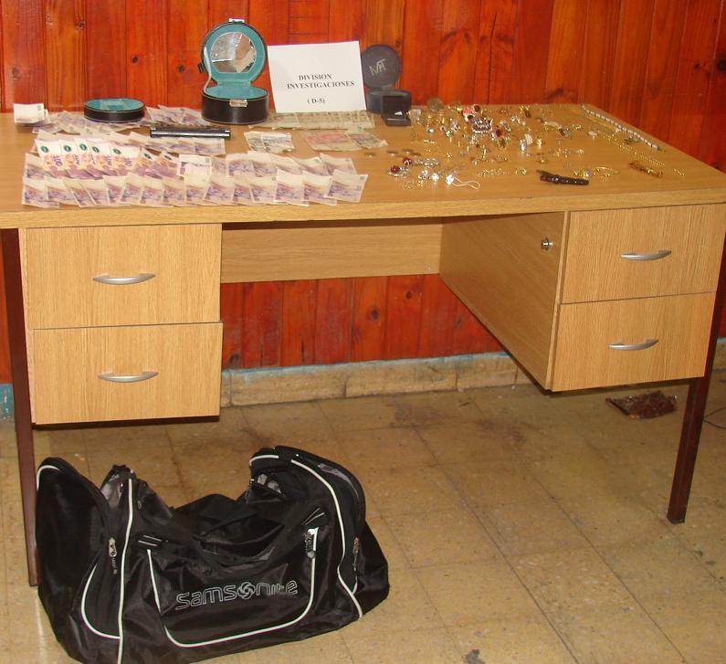 El personal interviniente, procedió al secuestro de una motocicleta Yamaha Crypton 110 cc., de color rojo con cachas negras en la que se conducían ambos sujetos y de 1 bolso de color negro que contenía en su interior 45 anillos, 8 cadenas con dijes, 1 reloj pulsera de mujer, 3 pulseras, 9 dijes, 3 alhajeros, 1 espadita (elemento punzante para forzar cerraduras), y unos $5.500 en efectivo.