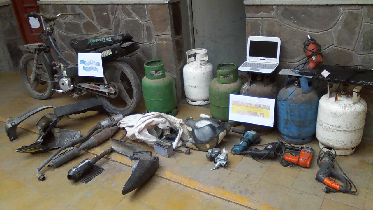 En tanto, en otro procedimiento efectuado en el distrito e Malli, se procedió al secuestro de una moto Brava 110cc. de color rojo, garrafas de 10 Kg., taladros marca Sthill, implementos para baño, entre otros elementos.