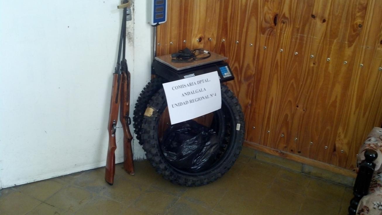 Del lugar se procedió al secuestro de una moto Yamaha Crypton semidesmantelada, tres cubiertas nuevas de motocicletas, dos rifles de aire comprimido y una balanza electrónica.