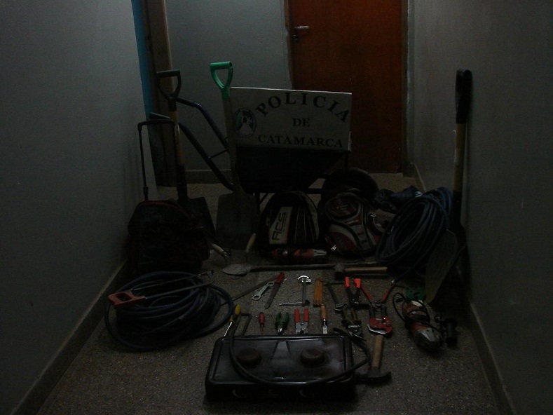 Tras una minuciosa investigación, el personal interviniente llegó hasta el predio de las 70 viviendas Norte, que se encuentra usurpado, y encontró oculto 1 carretilla, 2 mochilas, 1 anafe, 4 mechas de taladro, 1 sierra, 1 amoladora, 2 cucharas de albañil, 1 masa, 1 martillo, 1 campera de color azul, 1 punta, 1 barreta, 1 par de zapatillas de color negro y otro de color marrón, 1 cinta métrica, 1 rollo de tanza, 2 rollos de manguera, 3 palas y varias herramientas.