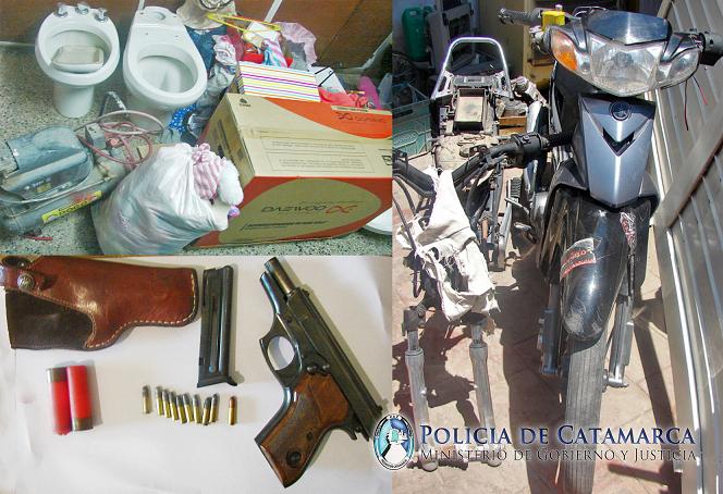Tras un exhaustivo trabajo de investigación, los investigadores lograron secuestrar una (1) pistola automática marca Bersa, Calibre 22, con cargador y diez (10) proyectiles, dos (2) cartuchos para escopeta Calibre 16, un (1) Aire Acondicionado Split, un (1) LCD 32”, una (1) Computadora completa (CPU, Monitor, Teclado y Mousse), una (1) Playstation 2, un (1) Juego de Baño completo, un (1) Compresor, un (1) motor de una máquina hormigonera, una (1) Bordeadora de césped, una (1) Impresora Multifunción, un (1) Cinema Home, una (1) Motocicleta Yamaha Crypton 110 cc., (005-ICU), de color gris con negro, un (1) cuadro de una motocicleta 110 cc., con una (1) rueda, tres (3) motores de motocicletas desarmados, distintas moto partes, dos (2) teléfonos celulares, un (1) taladro, gran cantidad de ropa, calzado y juguetes.