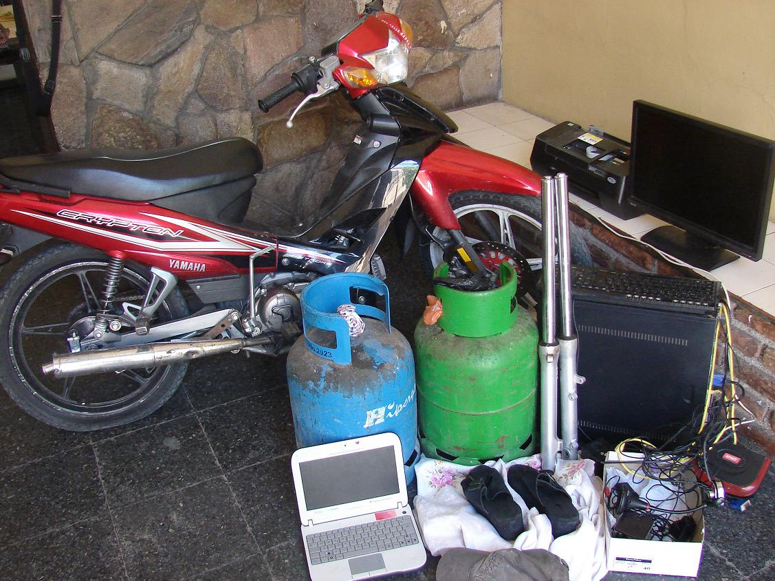 Se solicitó entonces la colaboración de otras unidades móviles. Dos unidades con efectivos de la Comisaría Quinta llegaron en apoyo y pudieron establecer que los malvivientes se habían dado a la fuga saltando una tapia, por lo que procedieron al secuestro de 1 computadora completa, 1 Netbook, 1 impresora, 1 webcam, 2 parlantes para PC que estaban envueltos en un mantel de color blanco, 2 garrafas de 10 kg, una gorra de color verde, 2 cargadores para celular y 1 motocicleta Yamaha Crypton 110 cc., de color rojo en la que circulaban los sujetos, que habían sido dejados adentro del domicilio.